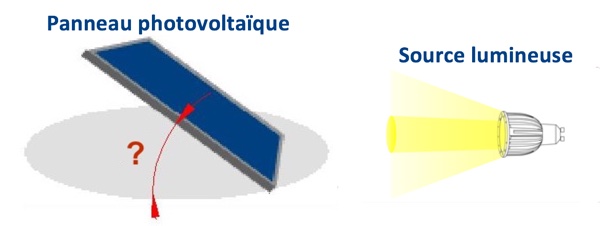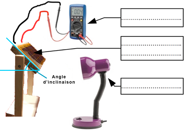 - Relever la tension du courant produit par le panneau photovoltaïque pour les angles d’inclinaison suivantes : 0° ; 30° ; 60° ; 90° ; 150°.