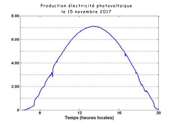 Le premier graphique ci-dessous représente la production d’une installation photovoltaïque placée sur un toit, un jour ensoleillé à la Réunion.