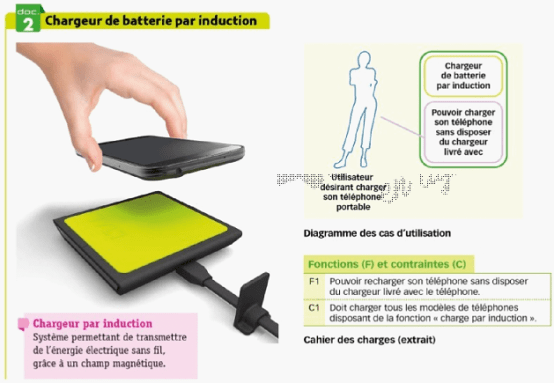 Pour créer ce nouvel objet, l’équipe de l’entreprise veut associer les fonctions d’un support de téléphone relié à une prise et d’un chargeur de batterie par induction.
