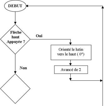 – Si la touche « flèche haut » est appuyée alors : – orienter le lutin vers le haut, – avancer le lutin de 2. |