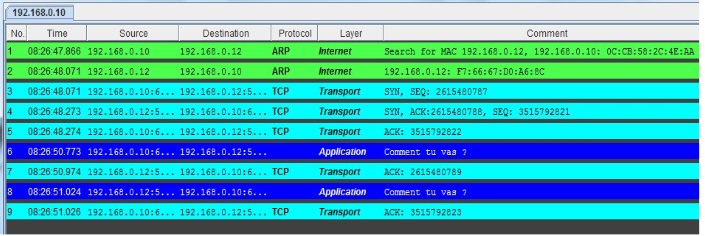 Installer sur le serveur un Serveur (mettre le port à 55555) et sur un des notebooks, installer un Generic Client et connectez-le au serveur. L’utiliser pour envoyer un message au serveur (lui donner son adresse IP). Observer les échanges. La couche de transport est utilisée pour la première fois.