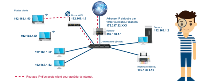 Chaque appareil d’un réseau informatique possède un numéro qui s’appelle l’adresse IP. Ce numéro est attribué par le routeur. Les équipements peuvent ainsi communiquer et se reconnaître sur le réseau LAN ou WAN.