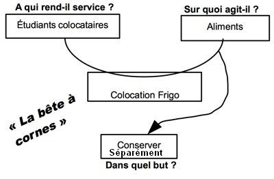 3°) Rédigez à partir de « la bête à cornes » une phrase permettant de formuler le besoin du «Colocation Frigo».