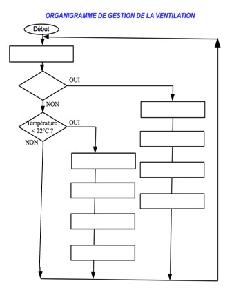 - En vous aidant du document ressources FICHE ORGANIGRAMME (Algorigramme) , coller et compléter l’organigramme ci-dessous qui décrit le fonctionnement du système de gestion de la ventilation.