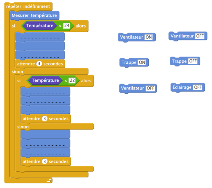Expressions à utiliser : Température > 24°C ? – Démarrer le ventilateur – Arrêter le ventilateur – Ouvrir la trappe – Fermer la trappe – Allumer la lampe – Éteindre la lampe – Attendre 3 secondes – Mesurer la température