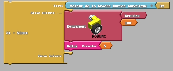 Problématique : je veux que mon robot avance à la vitesse de « 1000 » s’il y a un obstacle sur l’avant gauche le robot recule à la vitesse de « 100 » pendant 5 secondes, puis tourne à droite à la vitesse de « 500 » et avance à la vitesse de « 1000 »; s’il y a un obstacle sur l’avant droite le robot recule à la vitesse de « 100 » pendant 5 secondes, puis tourne à gauche à la vitesse de « 500 » et avance à la vitesse de « 1000 »
