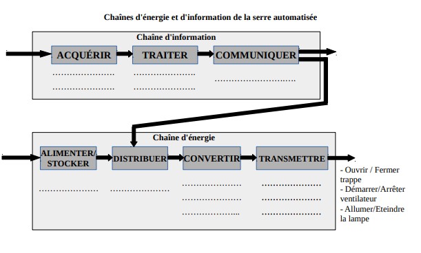 2°) Après avoir visionné la vidéo sur les chaines d’énergie et d’information, réaliser la chaîne d’énergie et d’information de la serre automatisée.